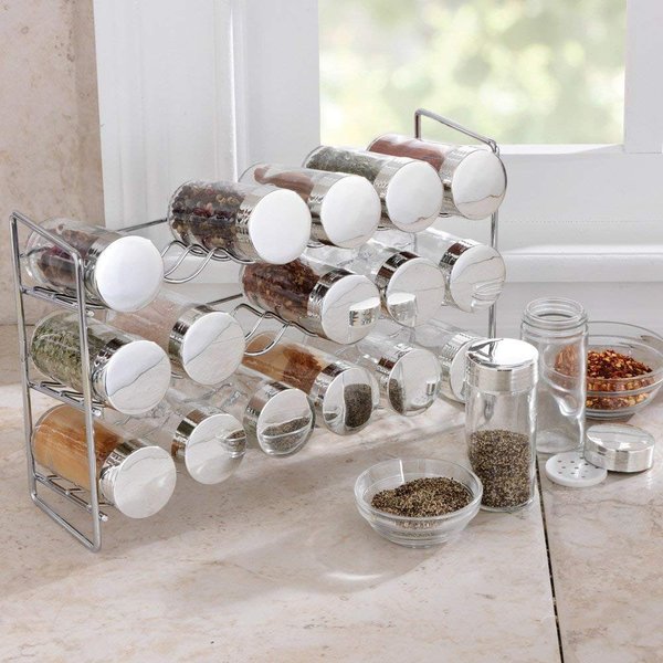 18個の、約141g容量のガラス瓶には、穴が開いたキャップとクロームメッキの蓋が含まれています。