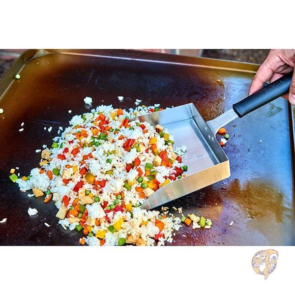 特大のステンレススチールのシャベルのようなスクープで、調理面から大量の食品をすくうことができます。
