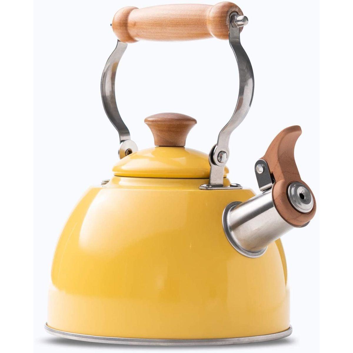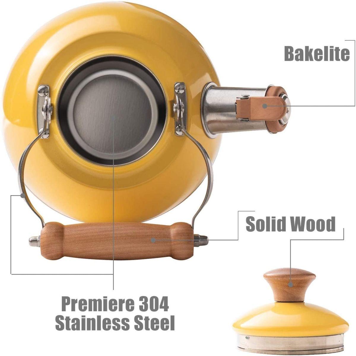 ROCKURWOK 木材ハンドルやかん 1.5L イエロー 笛吹きやかん/ケトル 湯沸かしティーポット ガスコンロ IH対応 ステンレス製 大容量 おしゃれ広口やかん