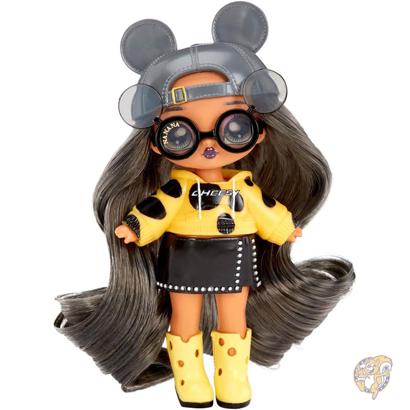 マウスをモチーフにしたミニドール: 「Marisa Mouse(マリサ・マウス)」は、自撮りタイムと「チーズ」と言うのが大好きなキャラクターです。身長約10cm(4インチ)で、長くウェーブのかかったグレーとブラックの髪を持ち、マウスをイメージしたフワフワの帽子を被っています。「Cheesy」とプリントされたフーディーに、スカート、成形ブーツを着用。